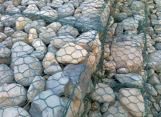 2.PVC锌-5%铝-混合稀土合金钢丝:在锌-5%铝-混合稀土合金钢丝的表面涂装PVC保护层,然后编织成六角铁丝网。这层PVC保护层将会大大增加在高污染环境中的保护,并且通过不同颜色的选择,使其能和周围环境融合。